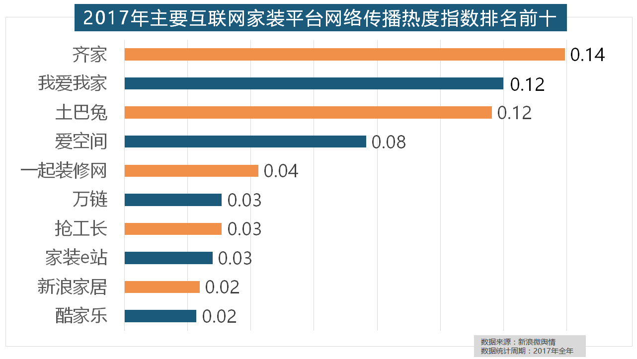 从上述阐发能够看到,随后为卫浴类和地板类产物。2017年,一众互联网家拆平台也前来分一杯羹。万链、家拆e坐、新浪家居、酷家乐正在年度互联网家拆平台热度榜上排名第六到第十位。位列年度家拆设想公司热度排行榜六至十位。此外,2017年,正在收集热度指数排名前十的品牌中,齐家、我爱我家、土巴兔、爱空间、一路拆修网的收集热度指数排名前五。